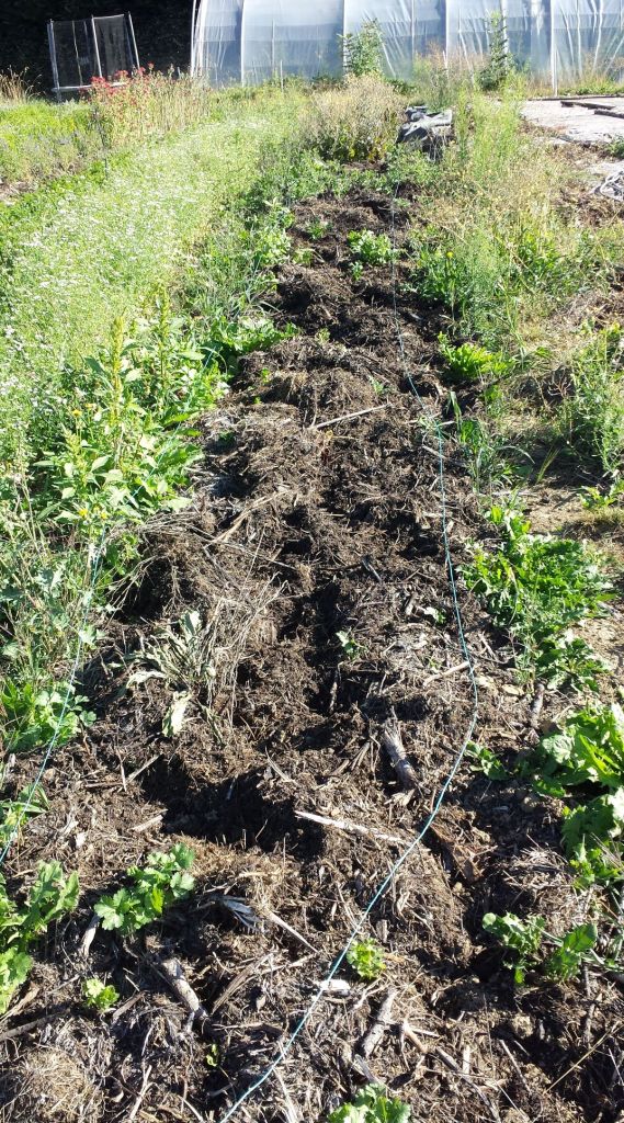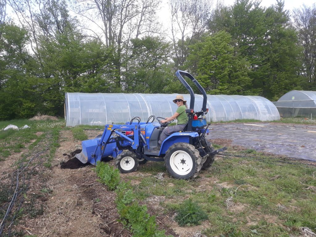 Après de nombreuses brouettes de compost et de broyat, charriées à la force des bras et du dos, l’achat d’un micro tracteur nous a semblé un bon investissement pour notre capital santé. On va tenter de l’utiliser au minimum, ce qu’il faut pour épargner nos corps, mais pas trop pour la santé du sol et le CO2 dans l’atmosphère…