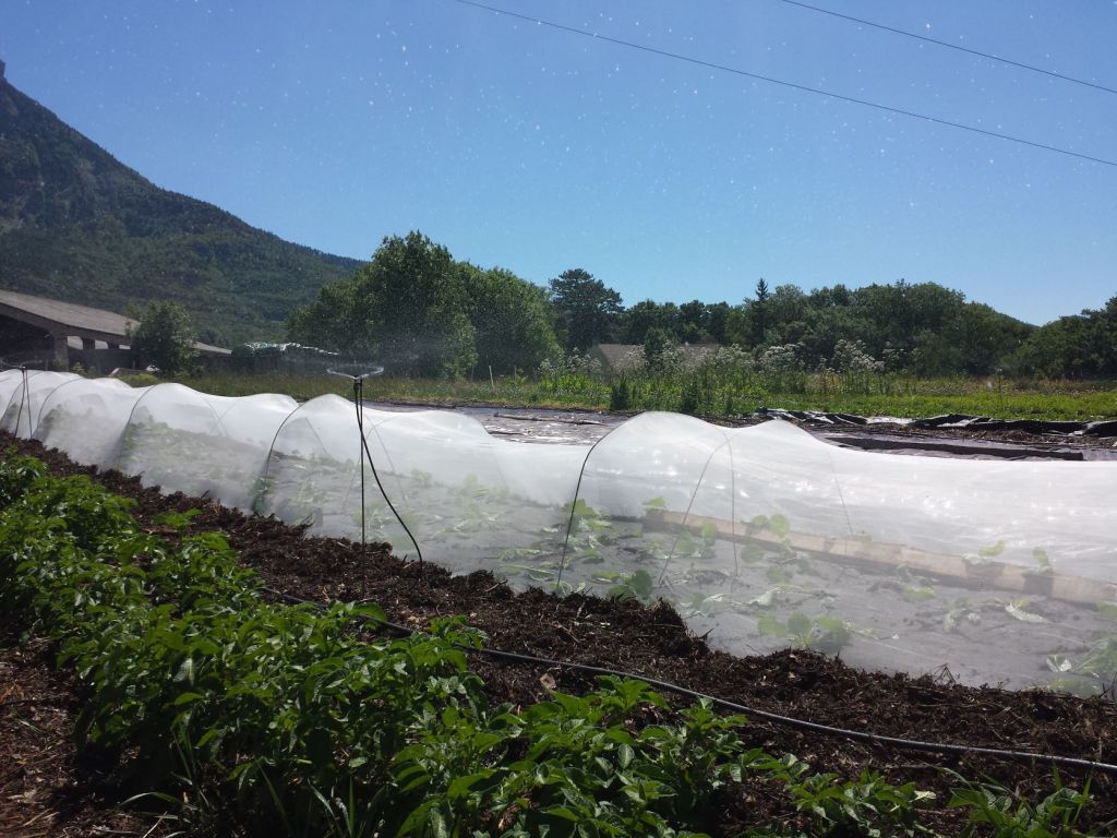 Planté sur un sol bâché au printemps, paillé avec du broyat, et recouvert d’une bâche tissée trouée.