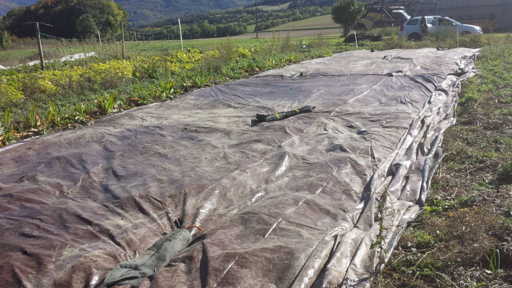 Bâchage des planches pour passer l’hiver : désherbage passif et protection de la vie du sol pour une amélioration de la terre.