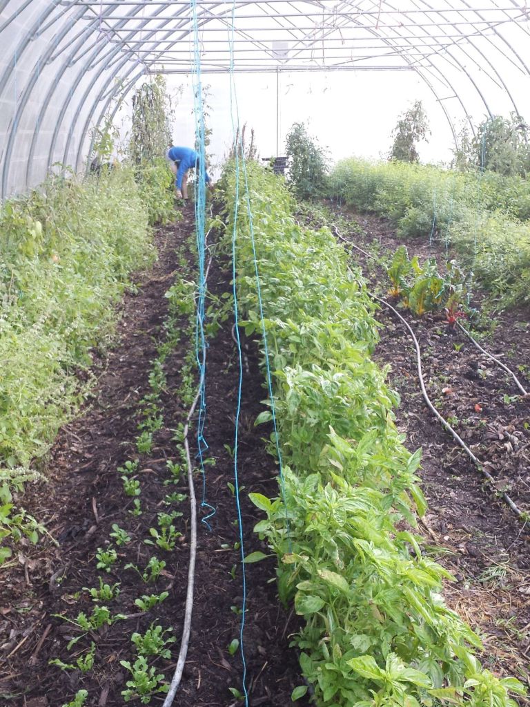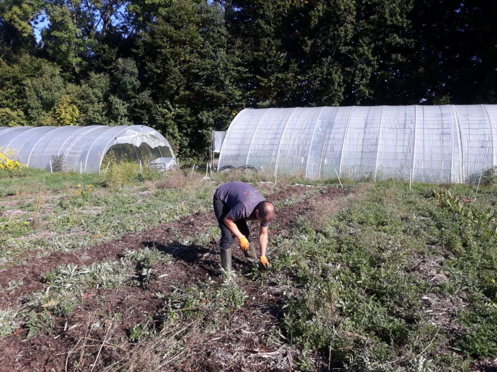 Début d’aménagement hivernal de la serre : on retire les culture d’été pour les remplacer par celles d’hiver. Ici transplantation de roquette, betterave, blette.