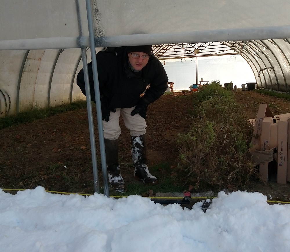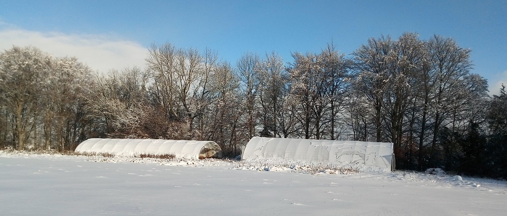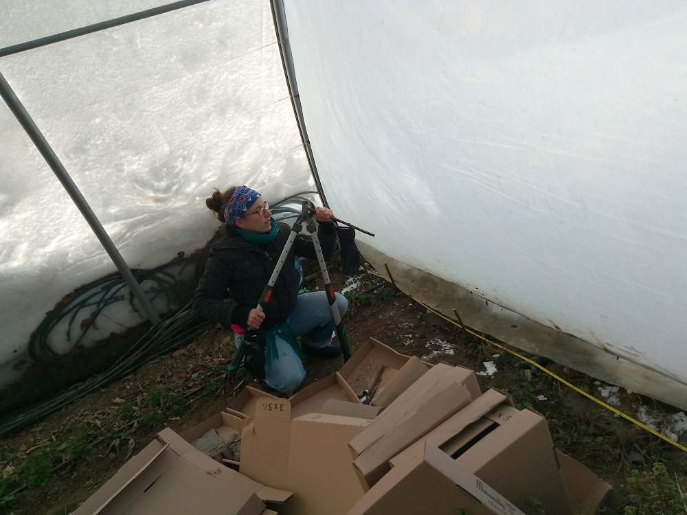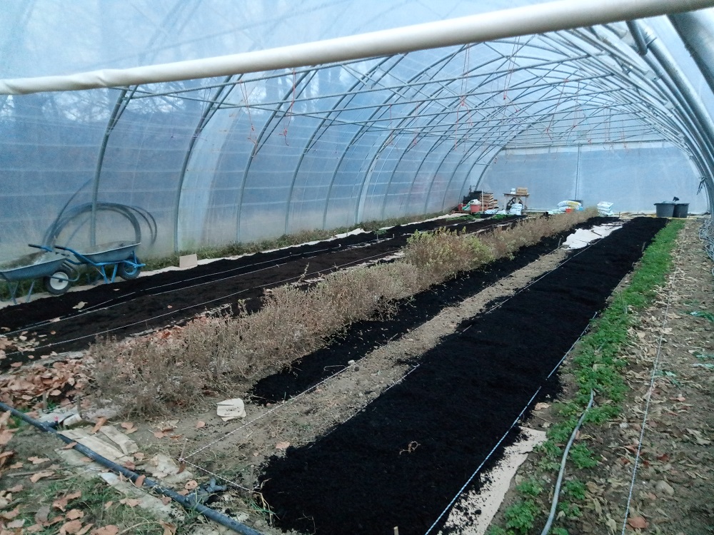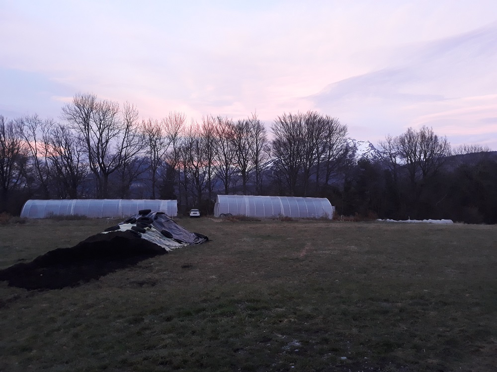 Bon, entre 2 sessions de neige, on a quand même réussi à dessiner nos planches (c’est à dire nos bandes de culture) dans les serres et on s’est fait livrer 13 tonnes de compost, qu’on a commencé à étaler (sur nos planches donc). Avec de l’aide en plus, merci les copains! C’était cool ! On voit avancer les choses quand on fait des trucs comme ça et c’est très satisfaisant.